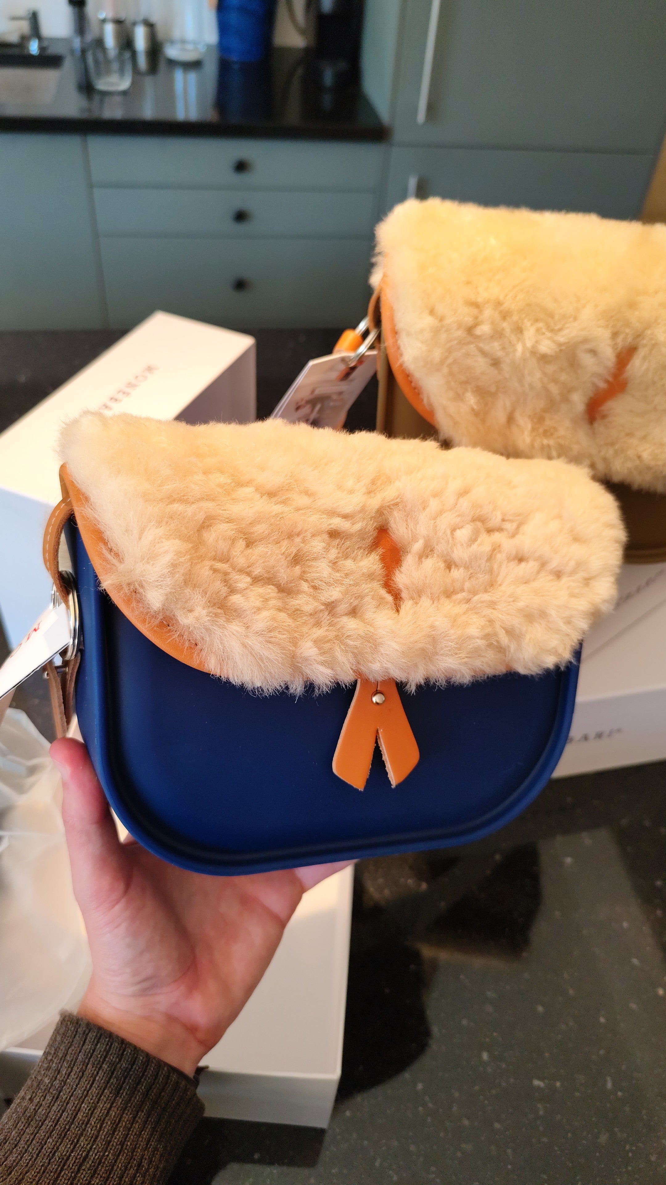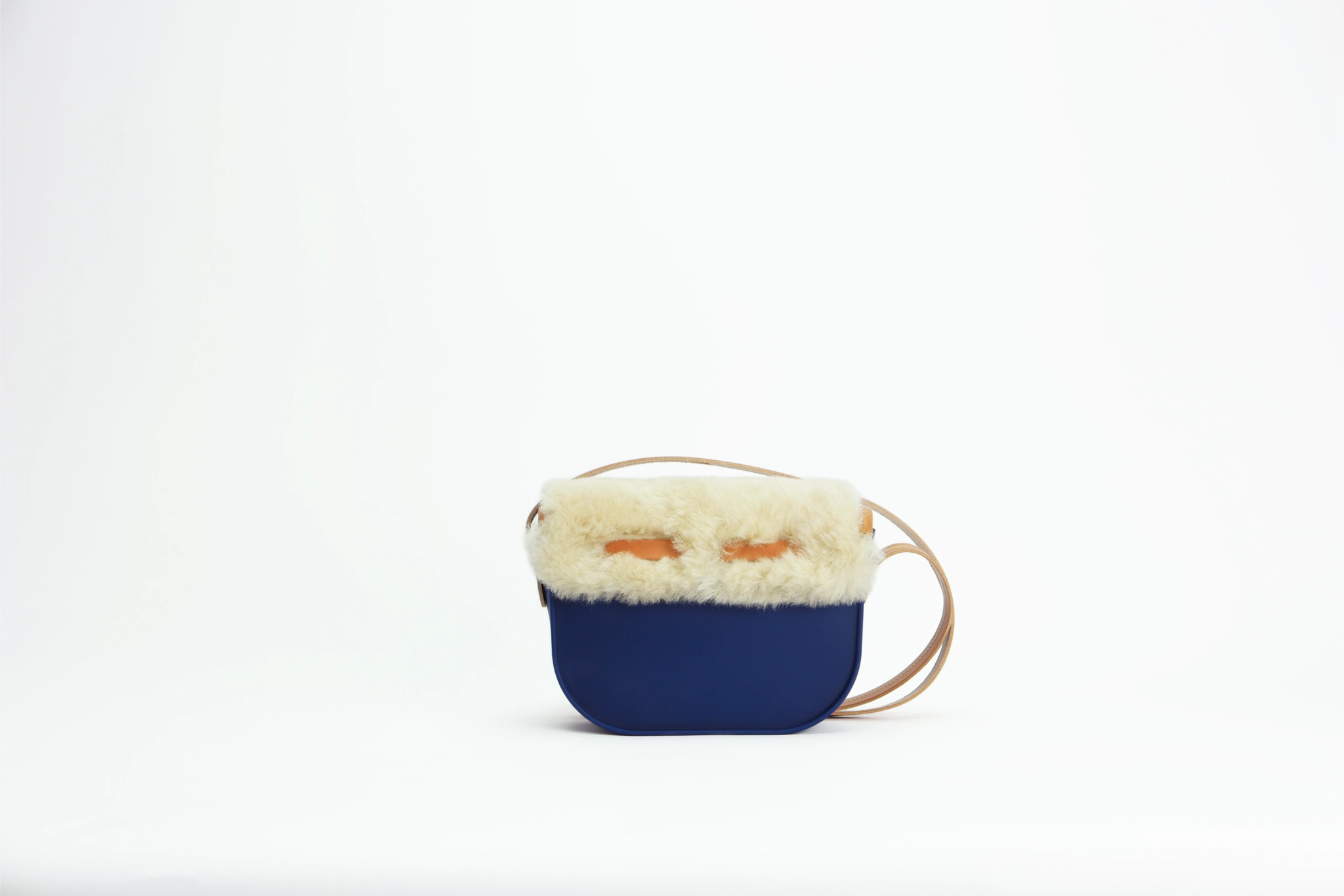 Le Supergomme® moumoute : sac à bandoulière bleu outremer innovant qui marie la gomme Supergomme® recyclable, le cuir pleine fleur et la véritable laine de mouton pour un accessoire cocooning aux dimensions parfaites (22x15x6 cm).