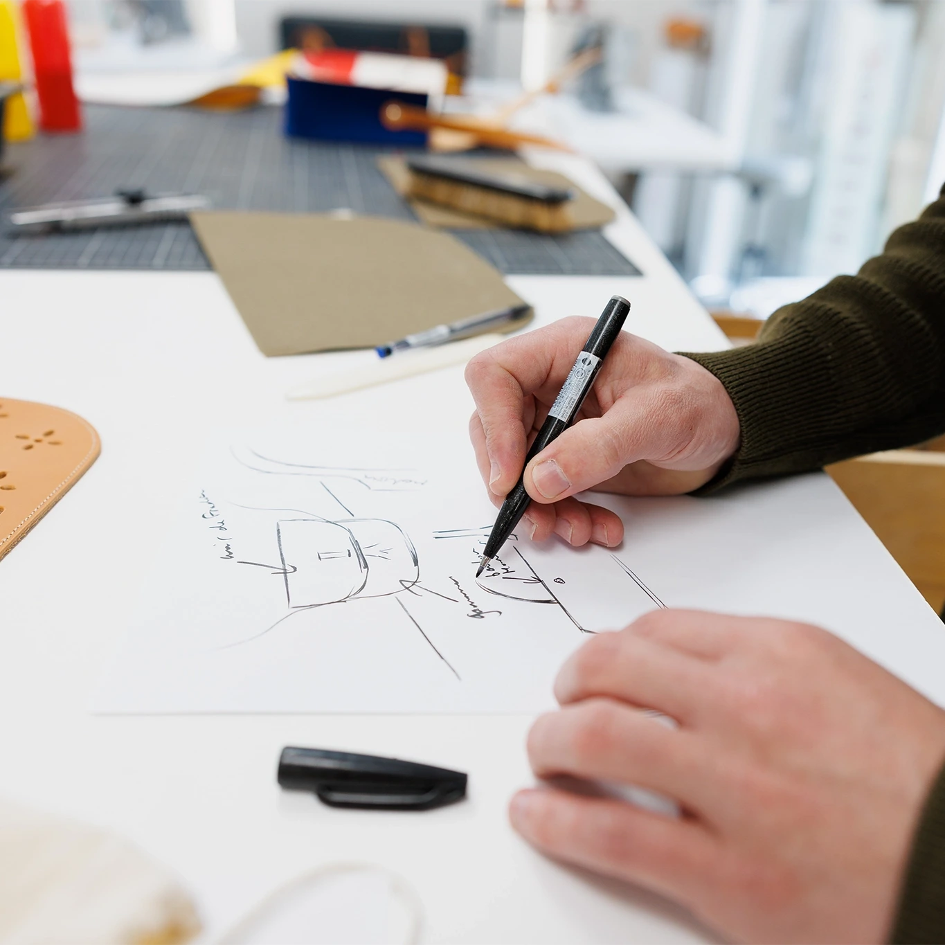 La création d'un sac Monébari commence par un travail minutieux de conception. Chaque modèle naît d'abord sur papier, où les proportions sont méticuleusement calculées pour garantir ergonomie et esthétique.