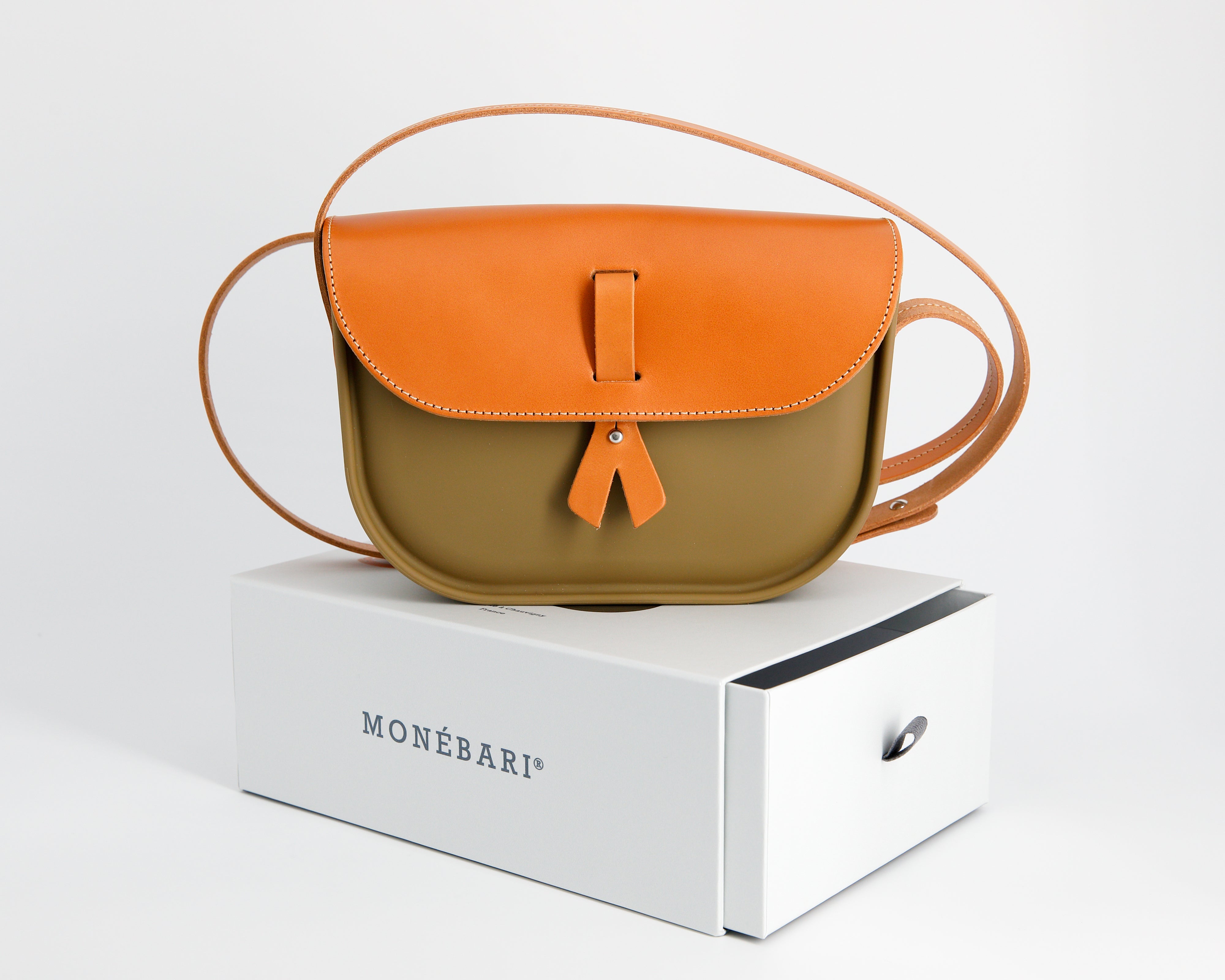 A feminine success in the Monébari range, our handbag is innovative in its composition of Supergomme® rubber and leather (flap and shoulder strap).